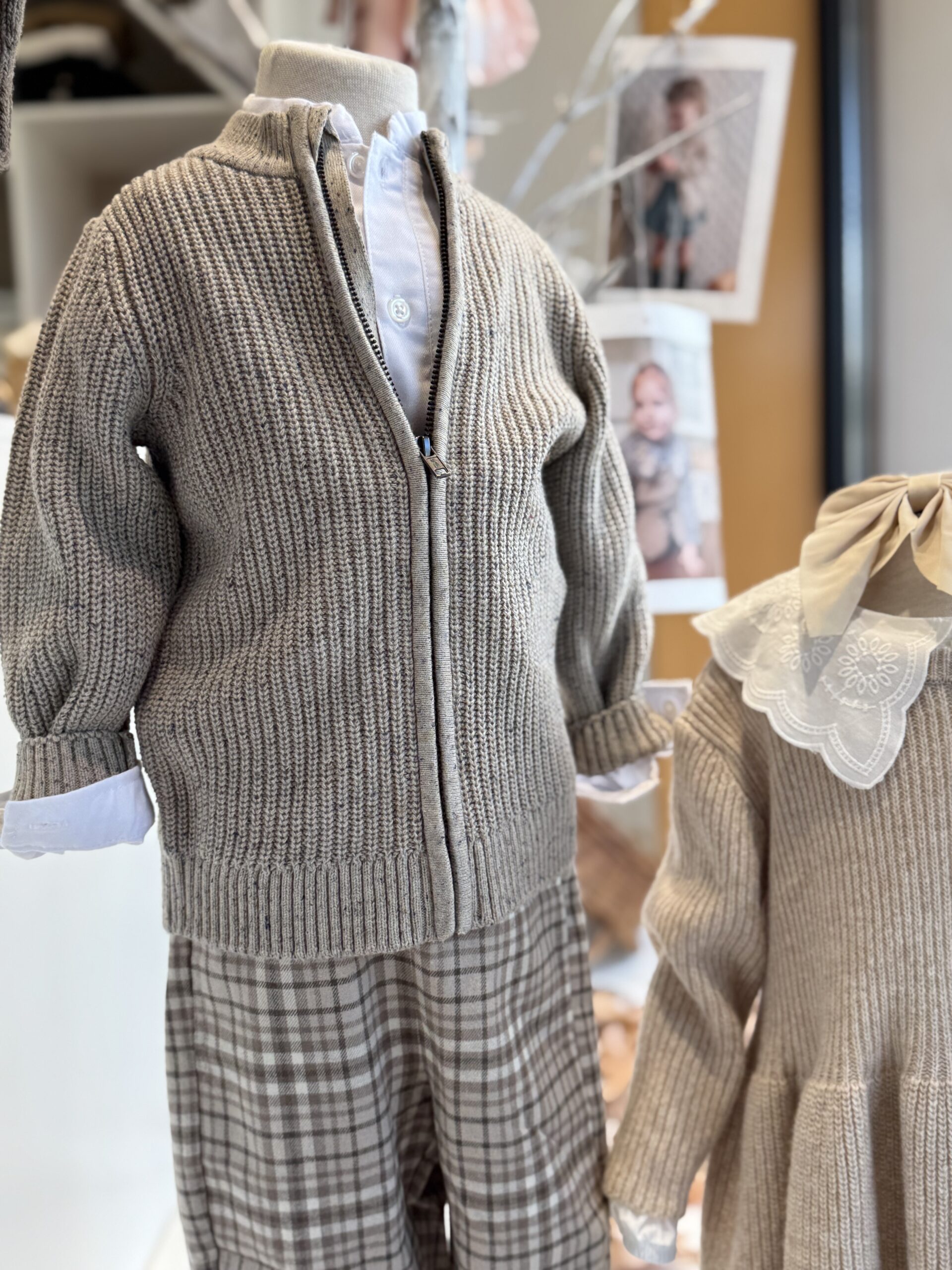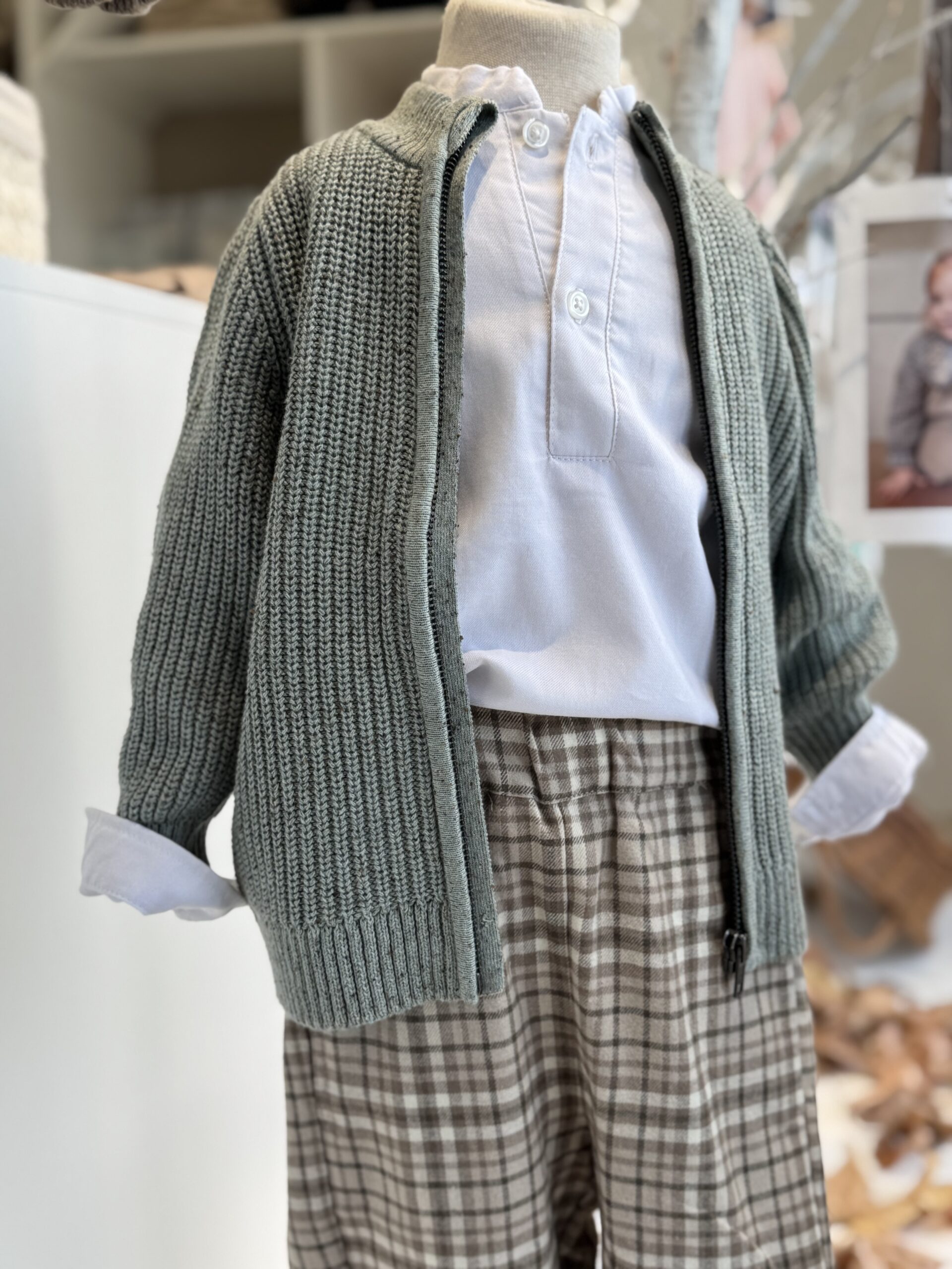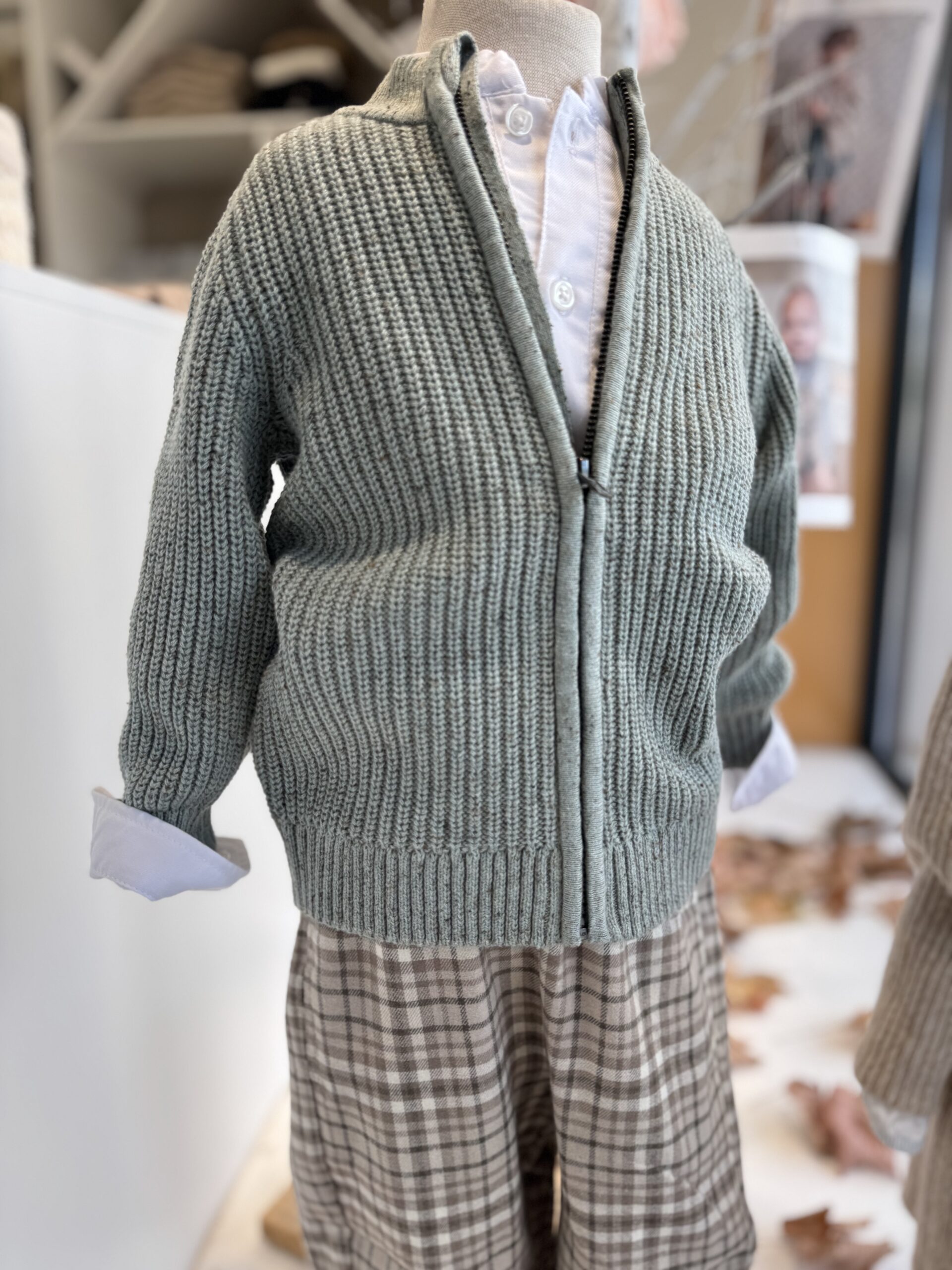 Casaco de malha de menino, disponível em duas cores: bege e verde.
