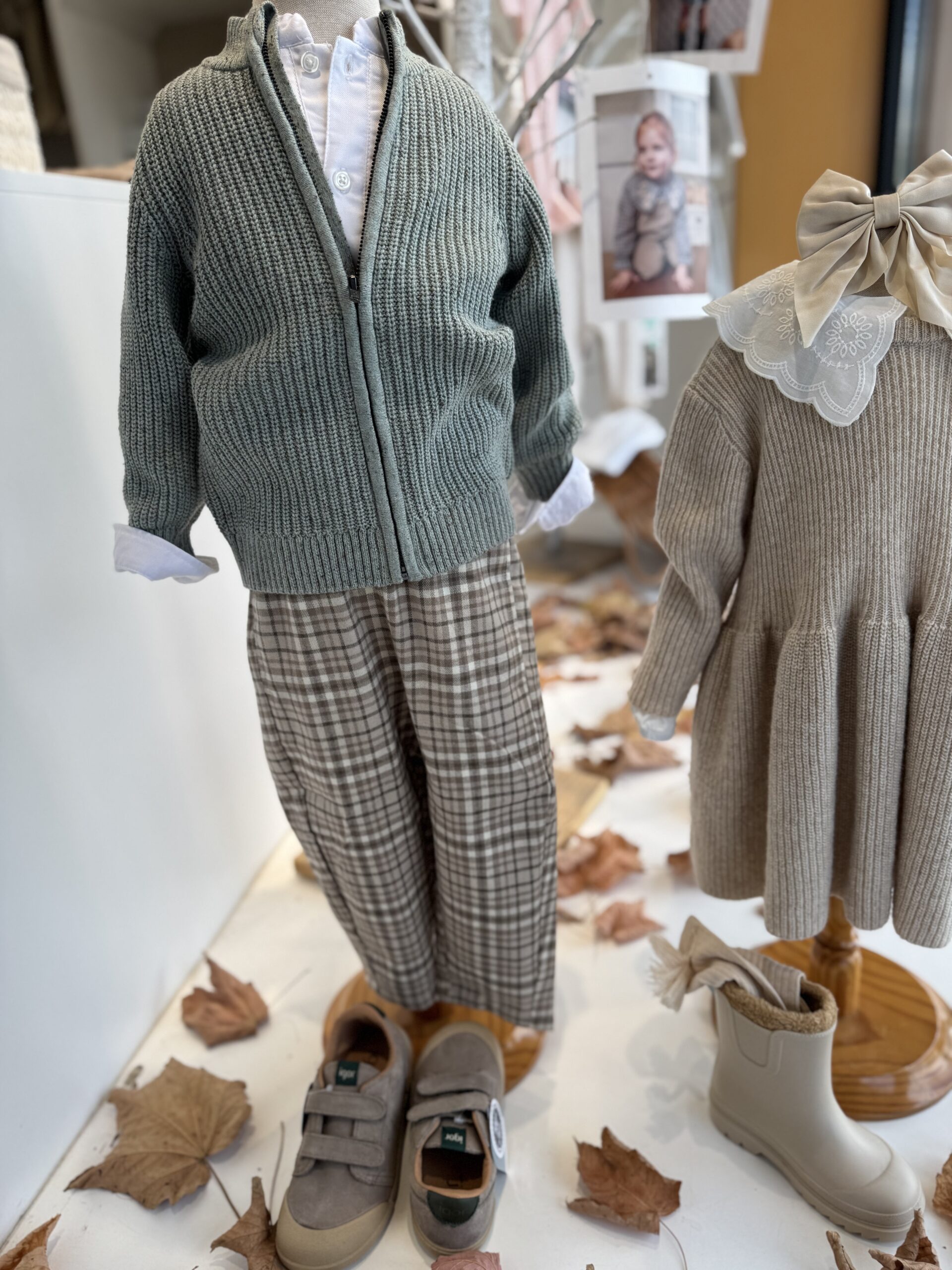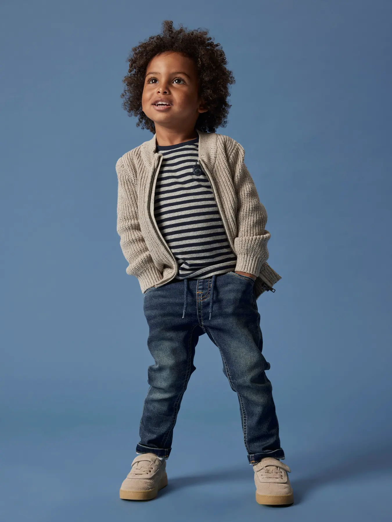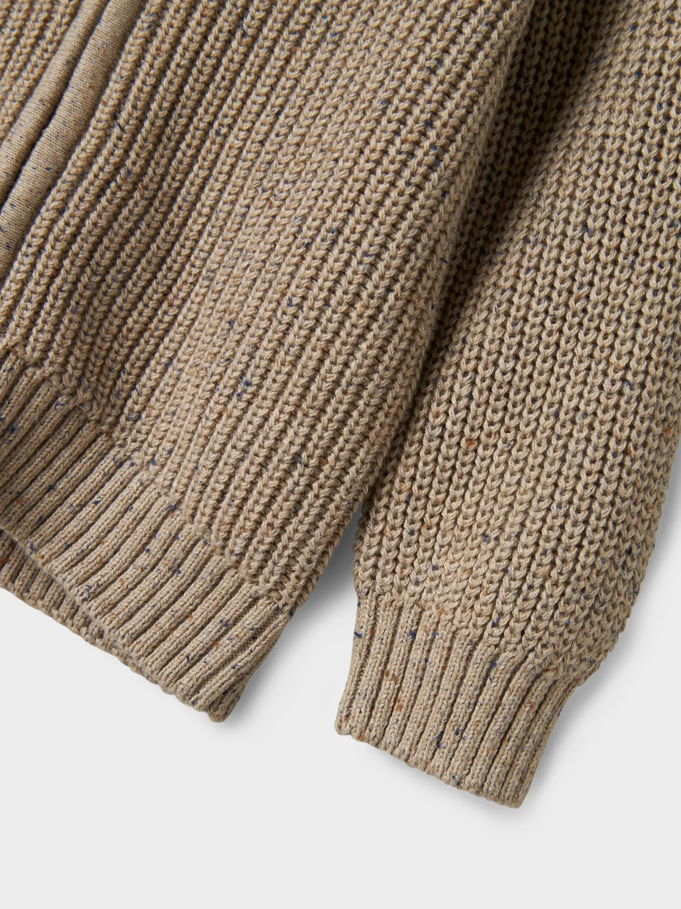 Casaco de malha de menino, disponível em duas cores: bege e verde.